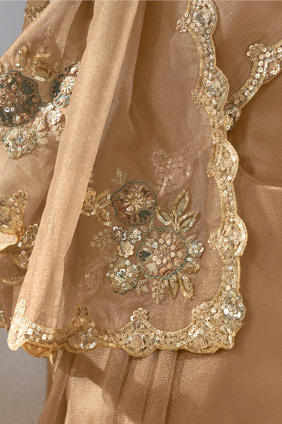 Redéfinissez votre style avec ce sari contemporain au tombé fluide, issu de la COLLECTION KANIKA. Les bordures sont sublimées par un travail de pierres et s’accompagnent d’une blouse coordonnée en impression floral, également ornée de dentelle assortie sur les manches. Entre textures royales, motifs traditionnels et silhouette qui honore la tradition tout en s’adaptant à l’air du temps, cette collection incarne l’élégance moderne.