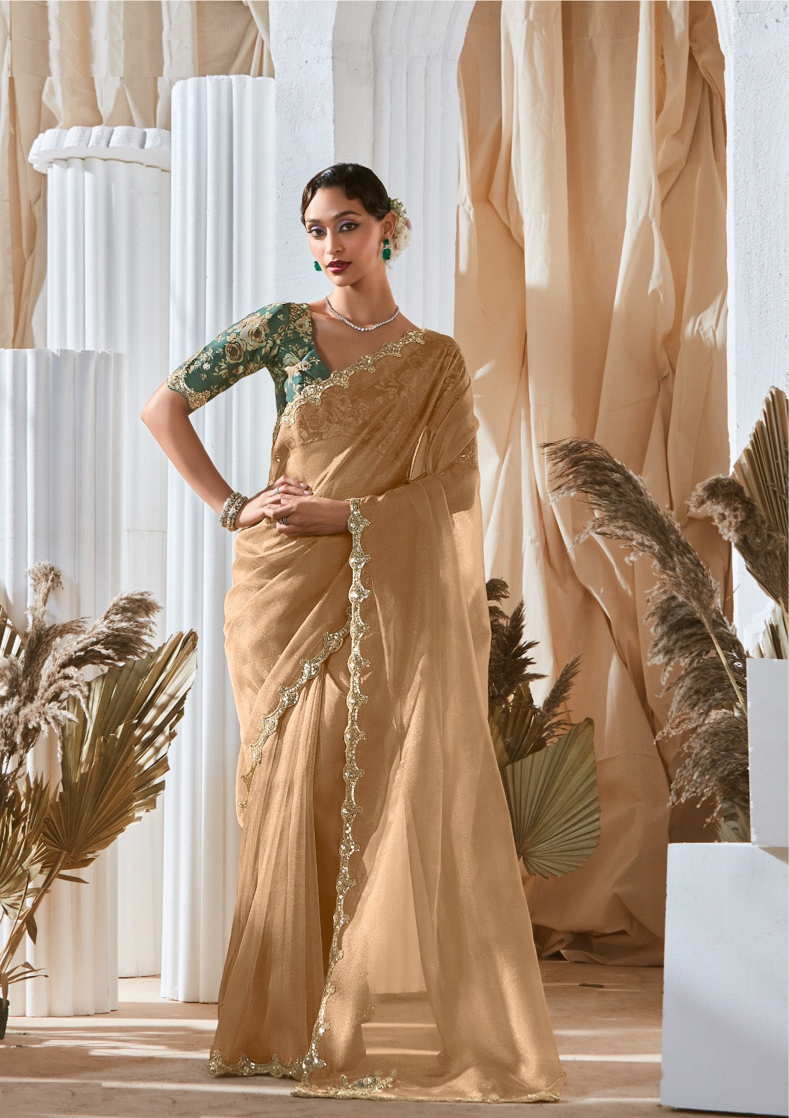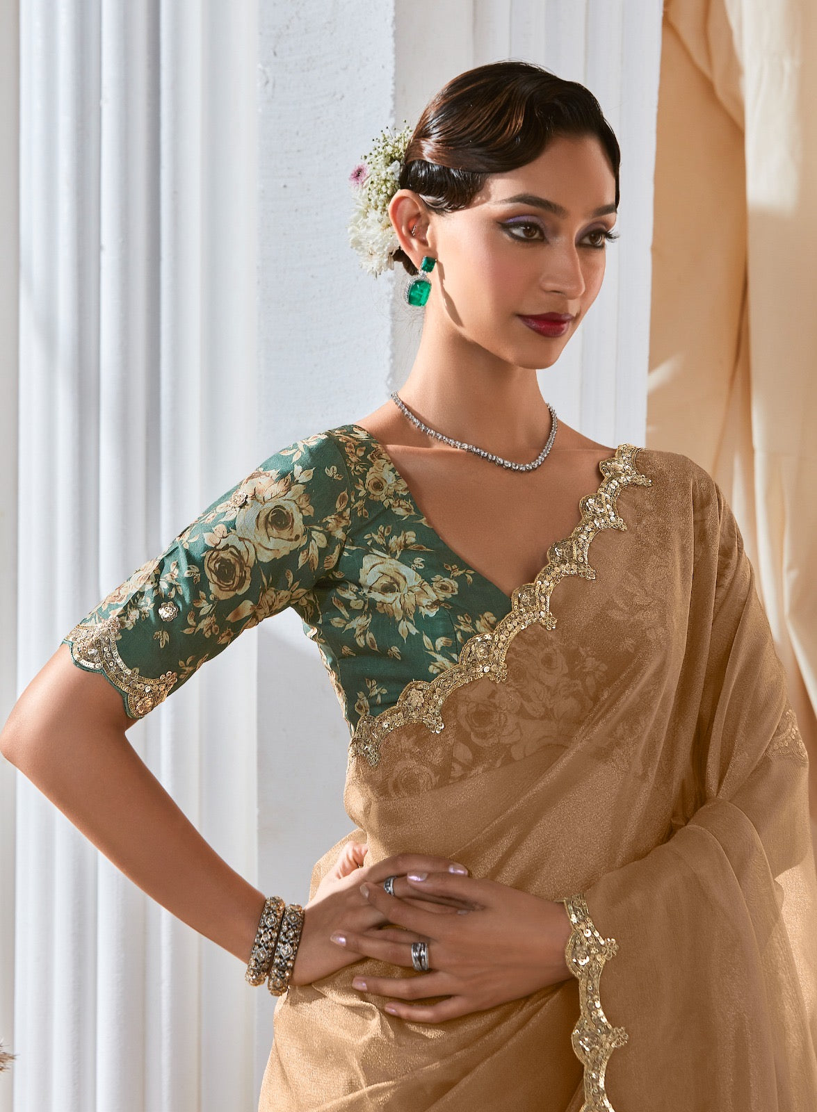 Sari moderne vert forêt et beige tissu fantaisie et dentelle COLLECTION KANIKA