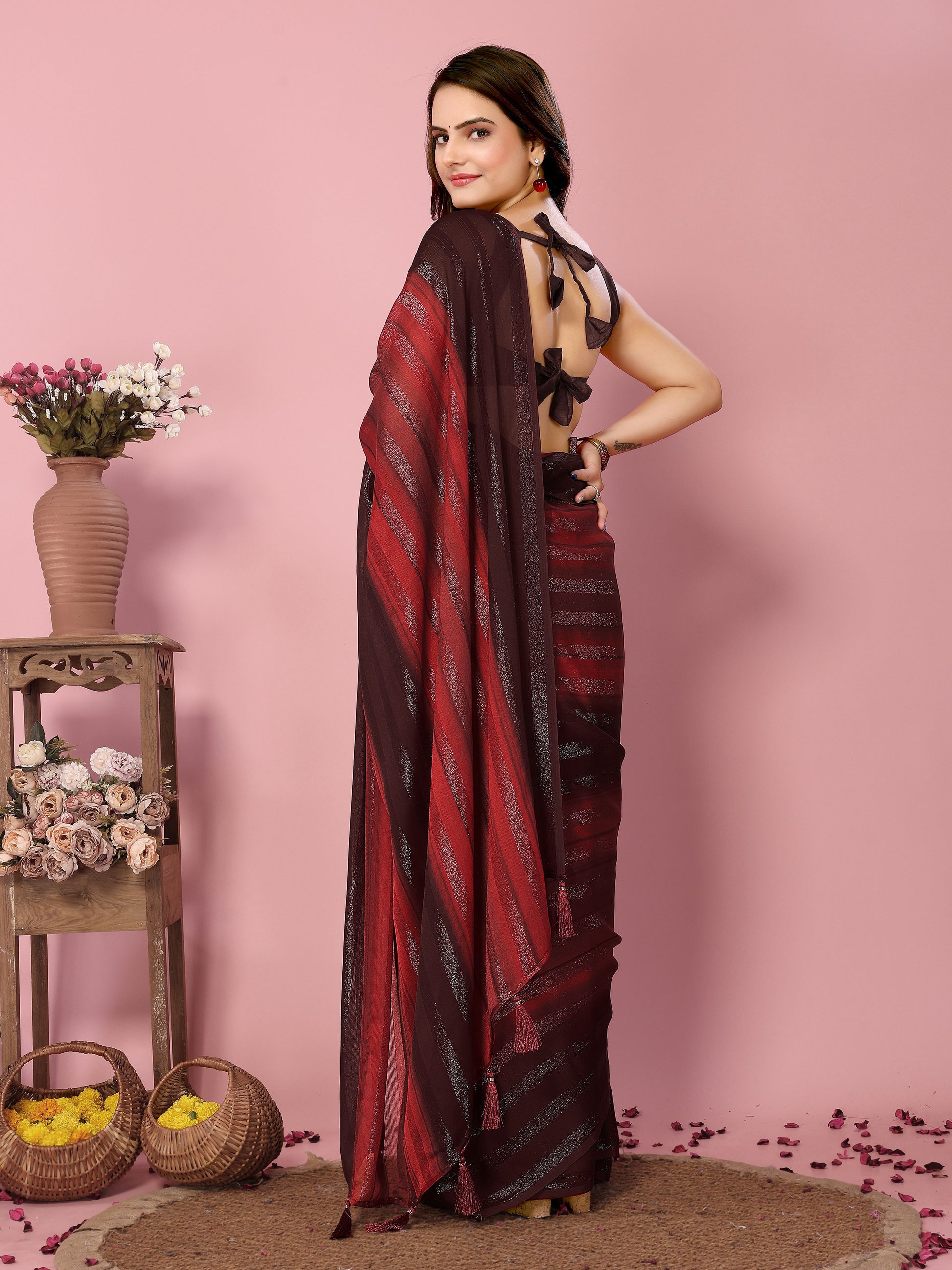 Sari prêt-à-porter rouge et noir en arc-en-ciel en soie avec motifs brillants