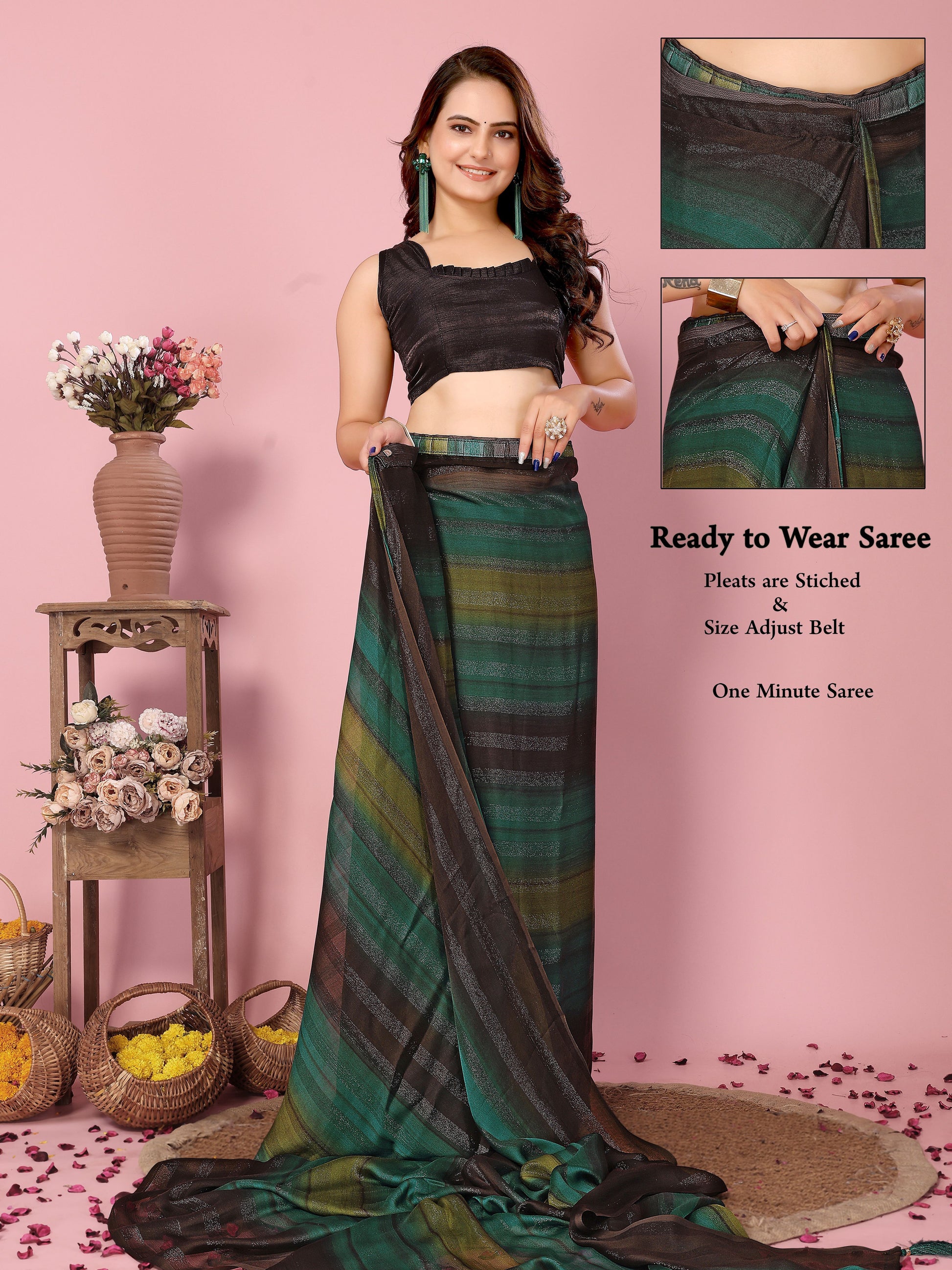 Sari prêt-à-porter vert et marron en arc-en-ciel en soie avec motifs brillants