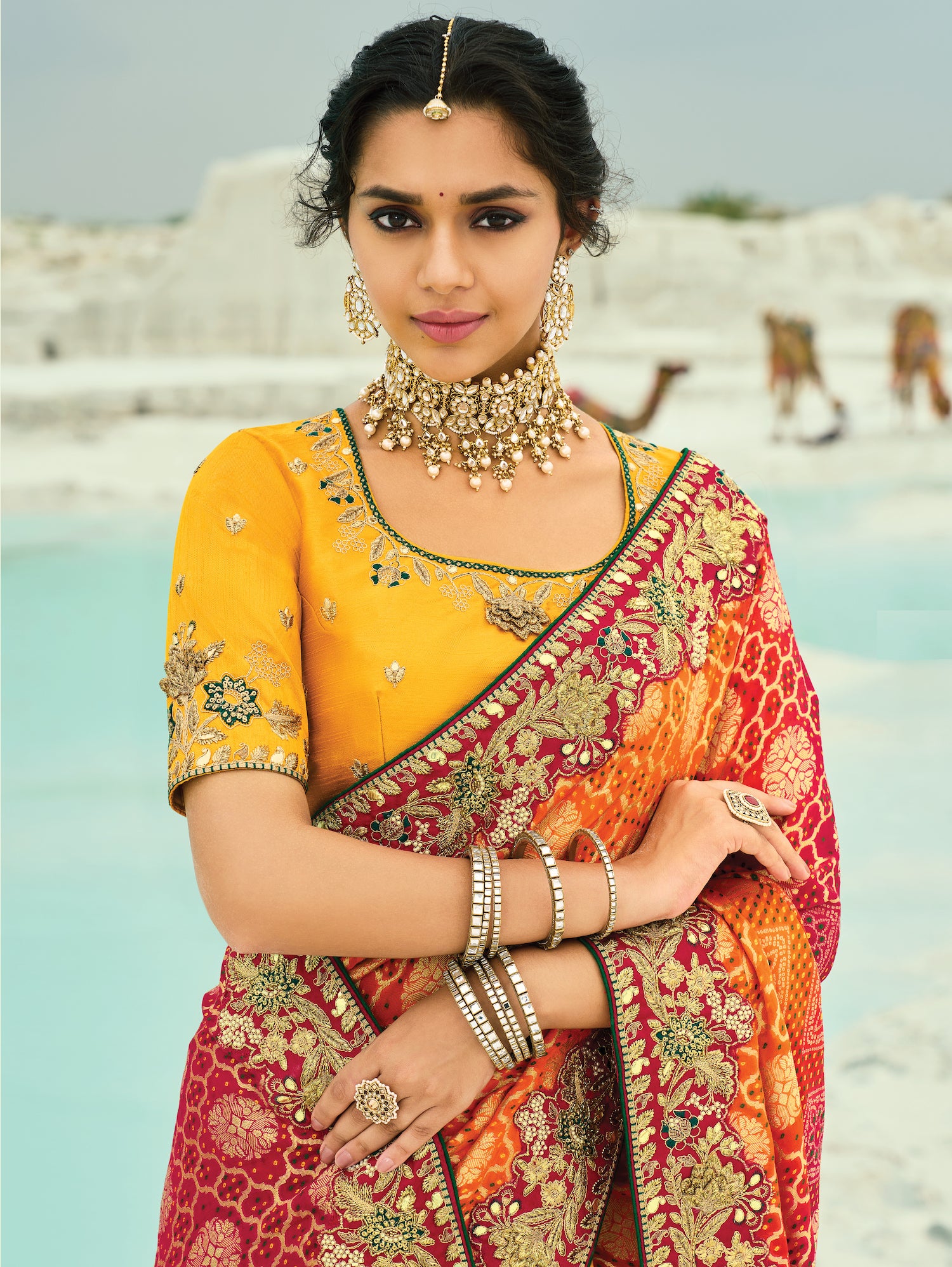 Sari jaune et orange en pur tissu georgette bandhej avec travail fait main de moti et cut-dana COLLECTION KHUSHI