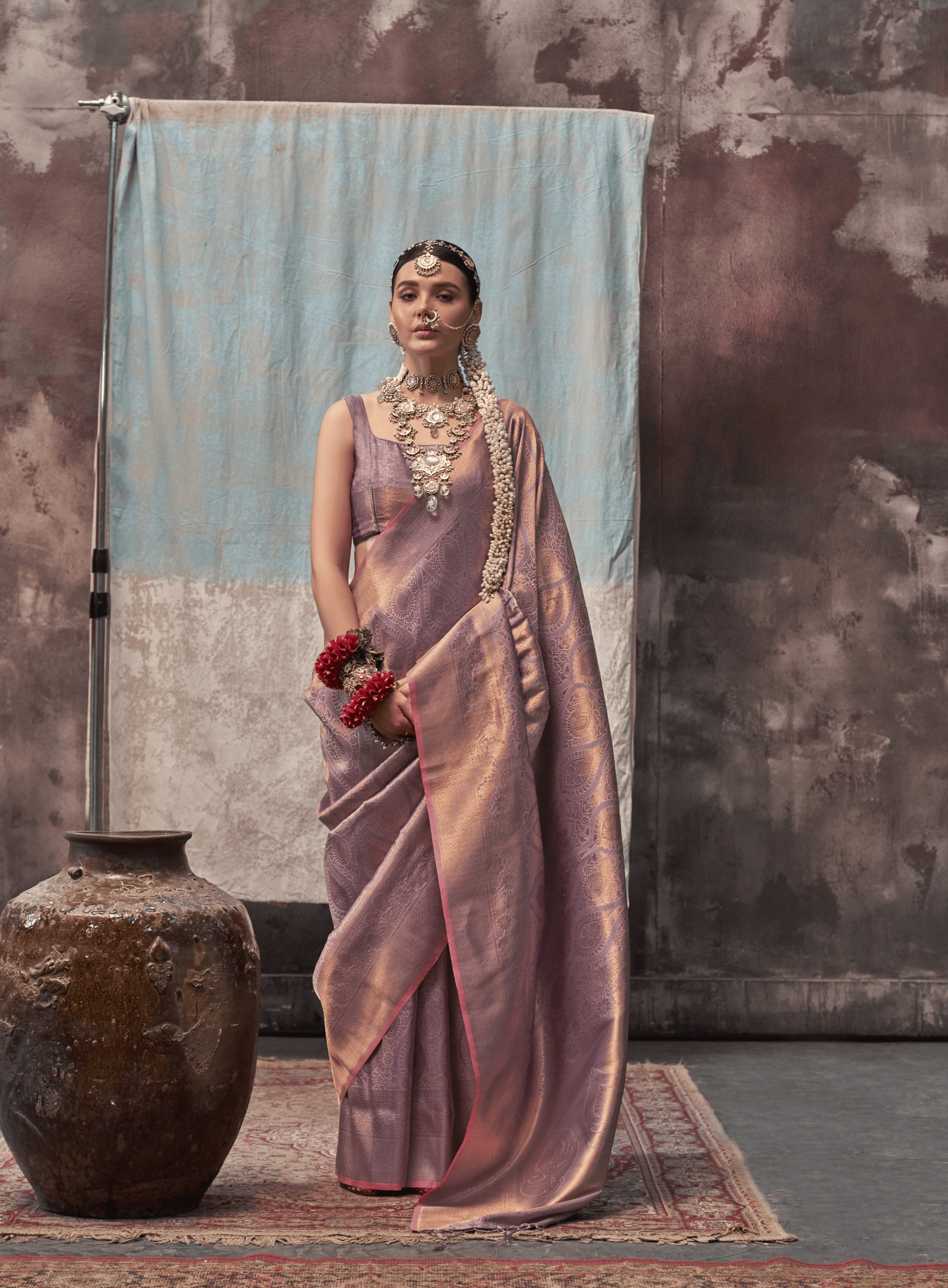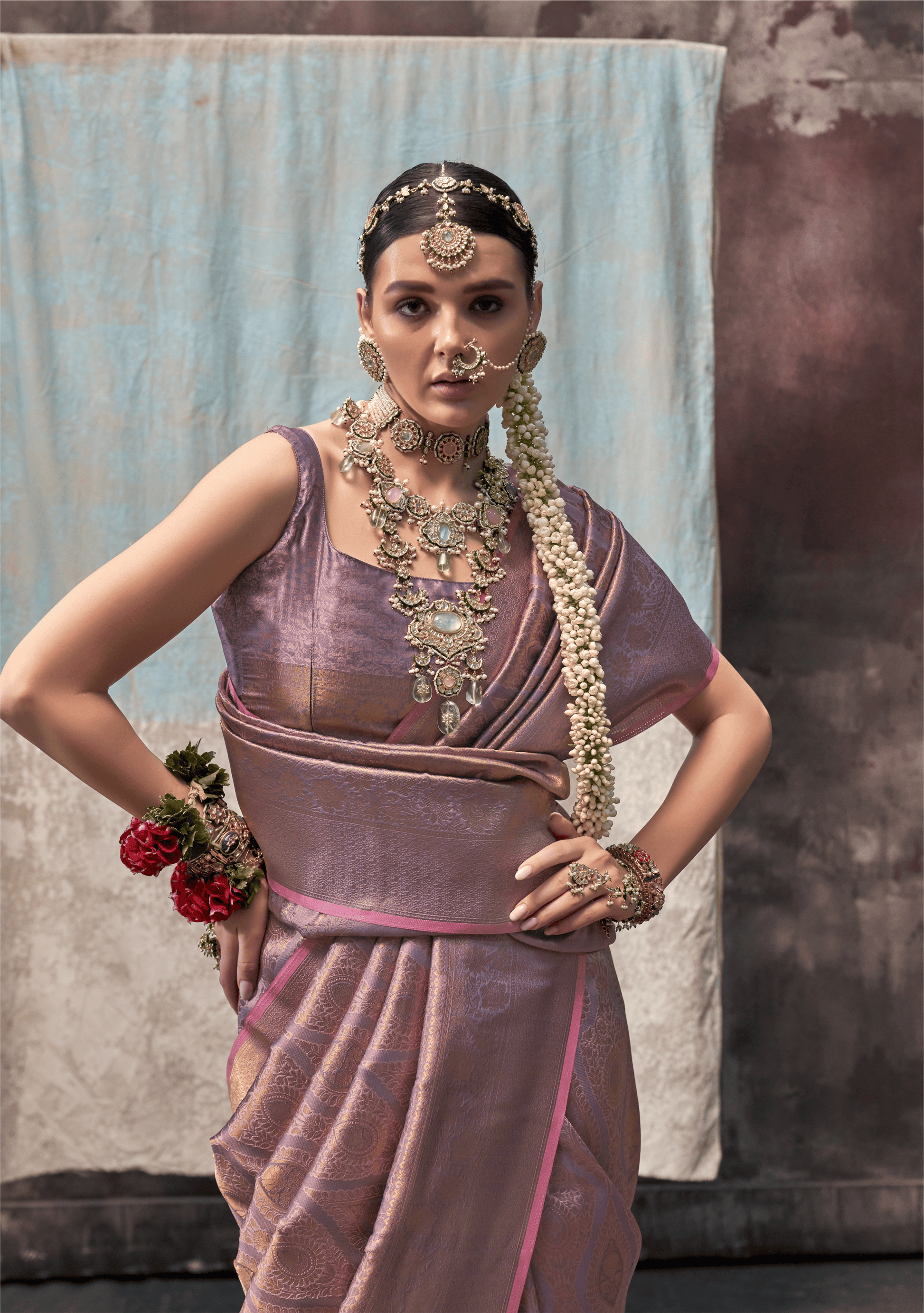 Sari rose mauve tissé main effet bicolore Tradition COLLECTION QALA