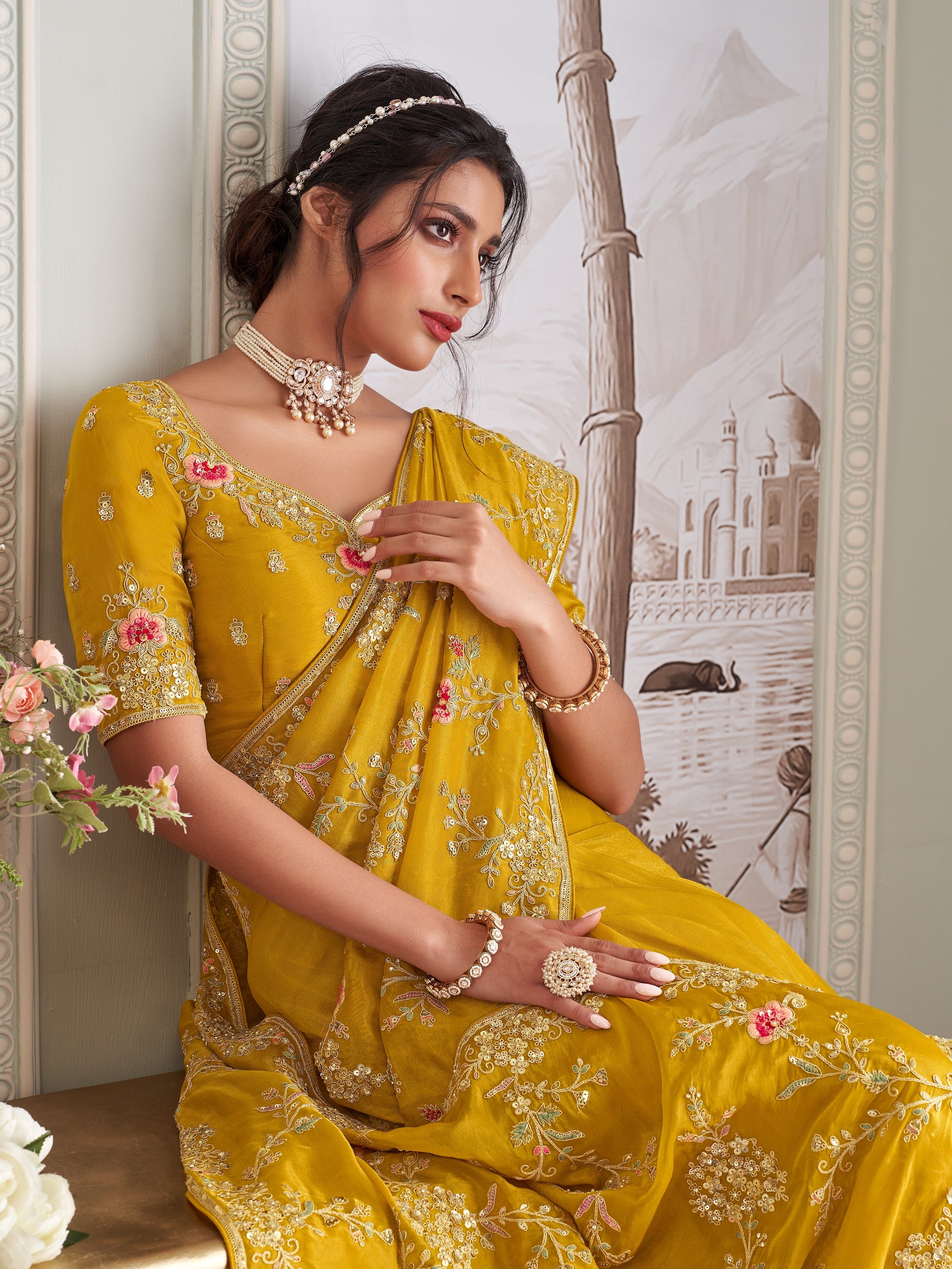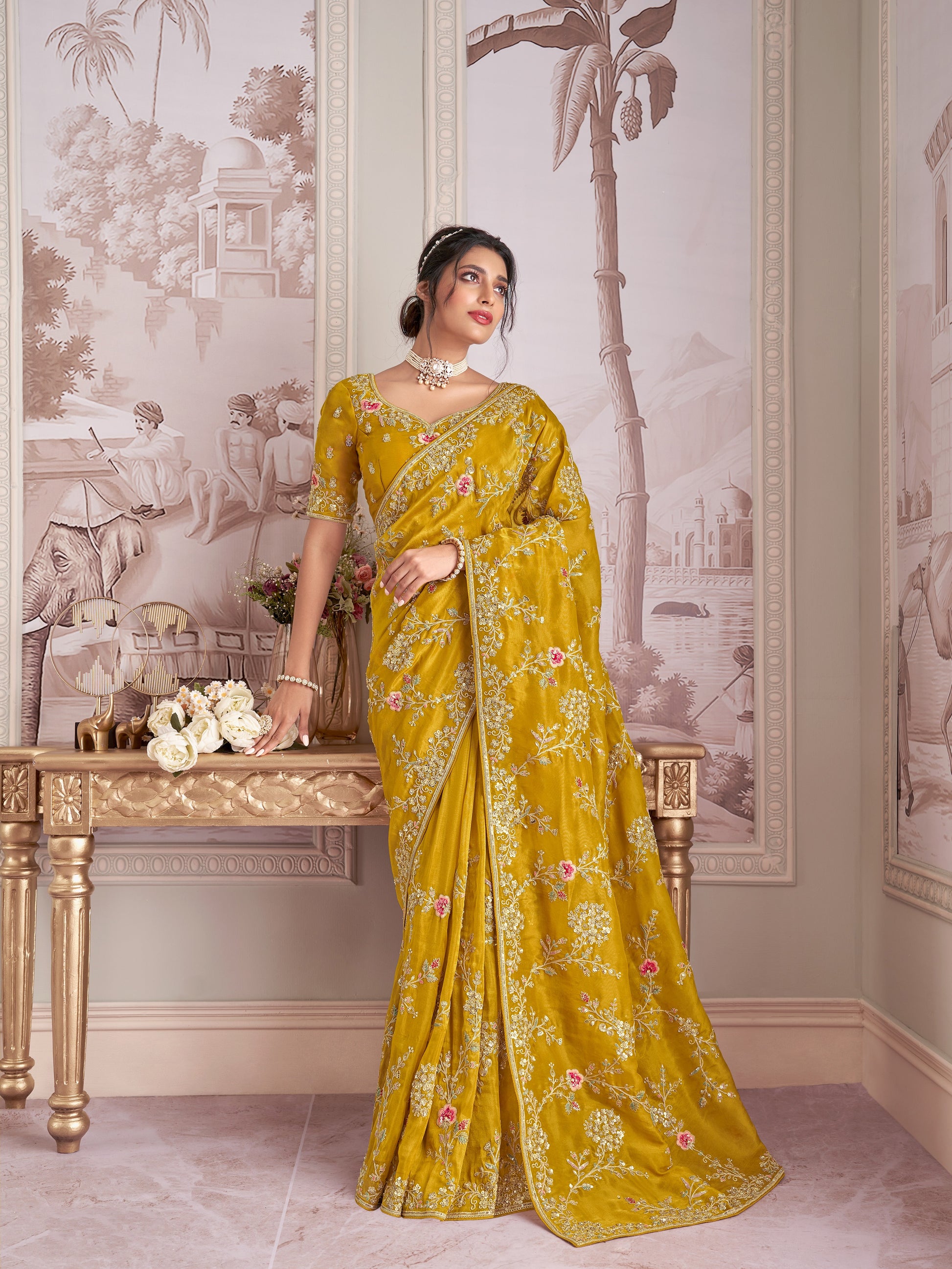 Sari travaillé en zari avec broderies et tissu fantaisie jaune moutarde et doré COLLECTION INDRA