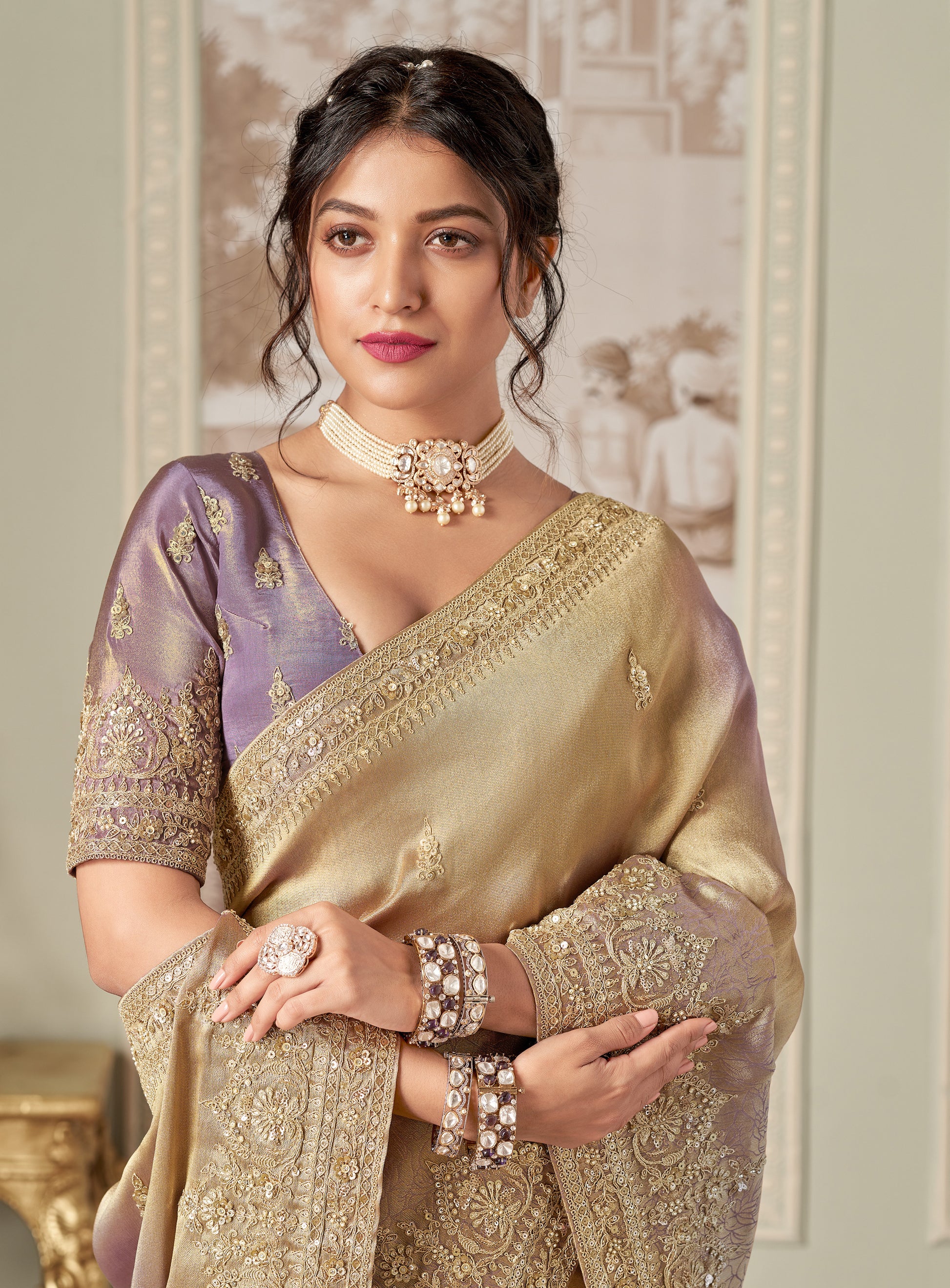 Sari travaillé en soie jacquard avec broderies et tissu fantaisie violet mauve et doré COLLECTION INDRA