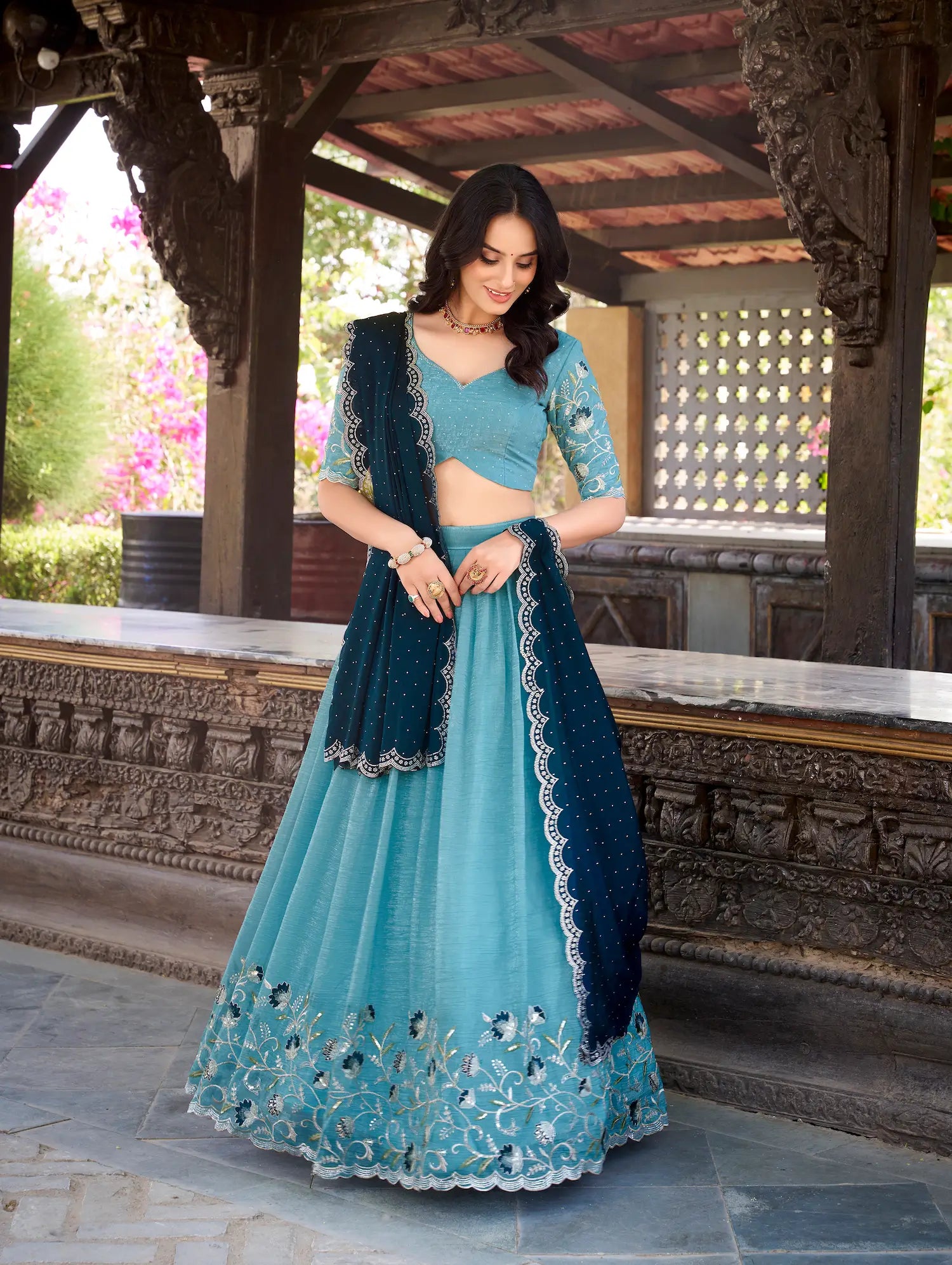 Lehenga Choli en soie brillante bleu océan, orné de broderies en sequins et fils avec finition hotfix COLLECTION AANCHAL