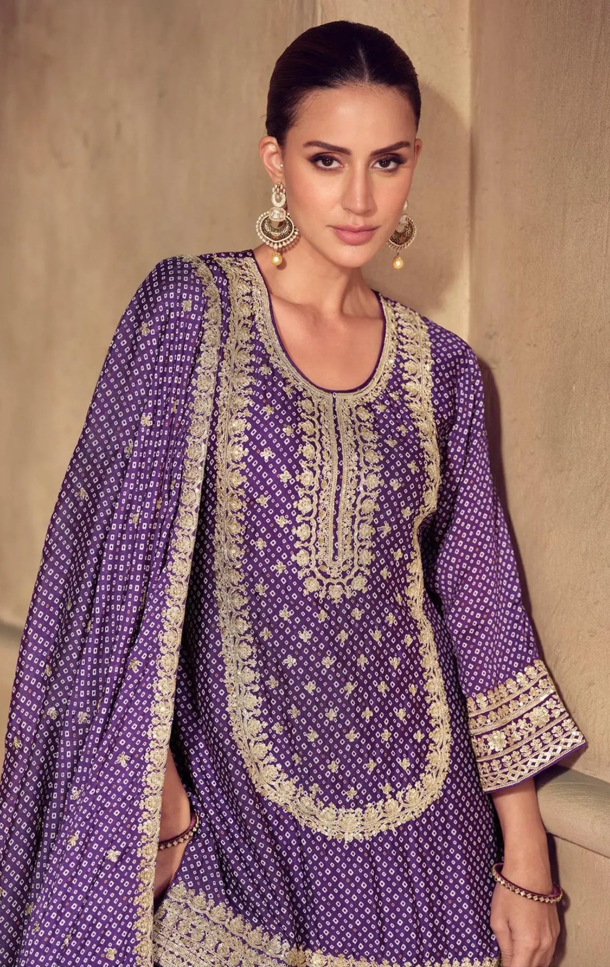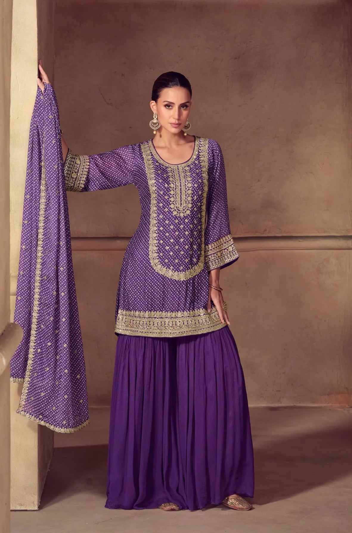 Sharara violet prune en soie Chinon chic avec imprimés et broderies