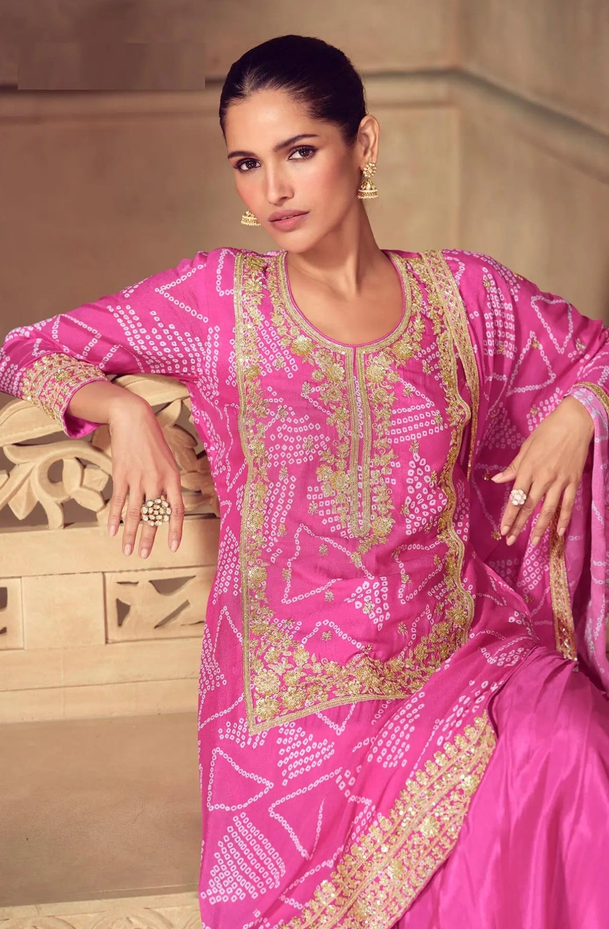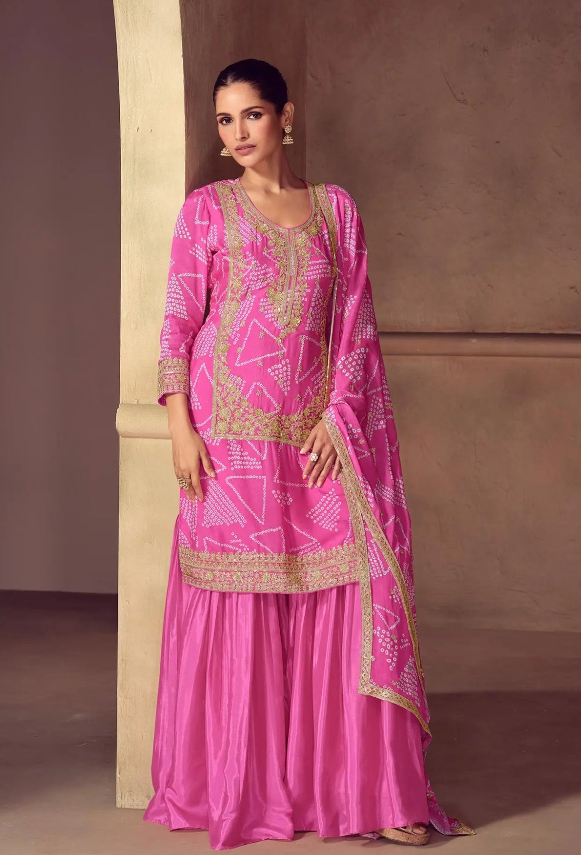 Sharara rose flamboyant en soie Chinon chic avec imprimés et broderies