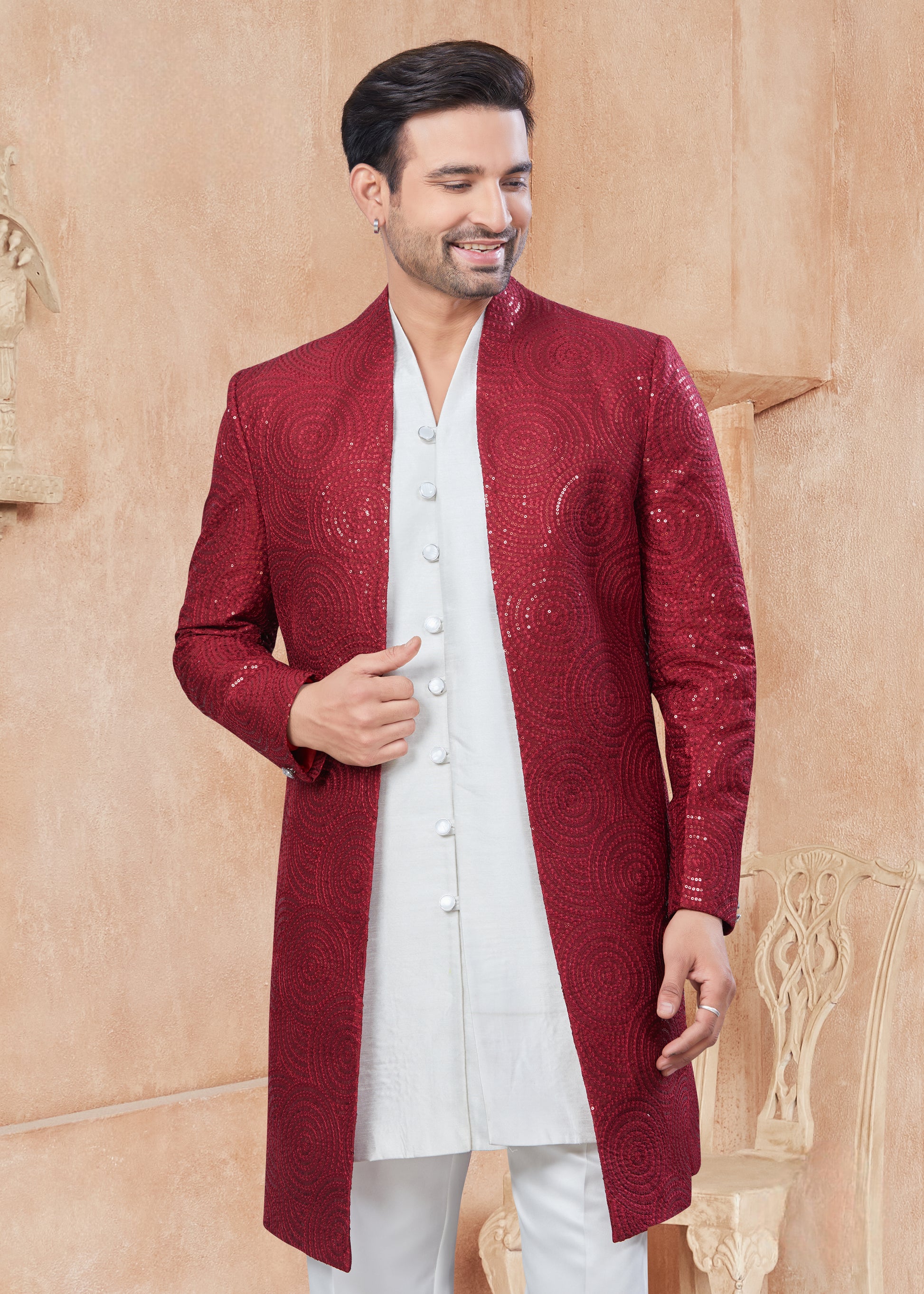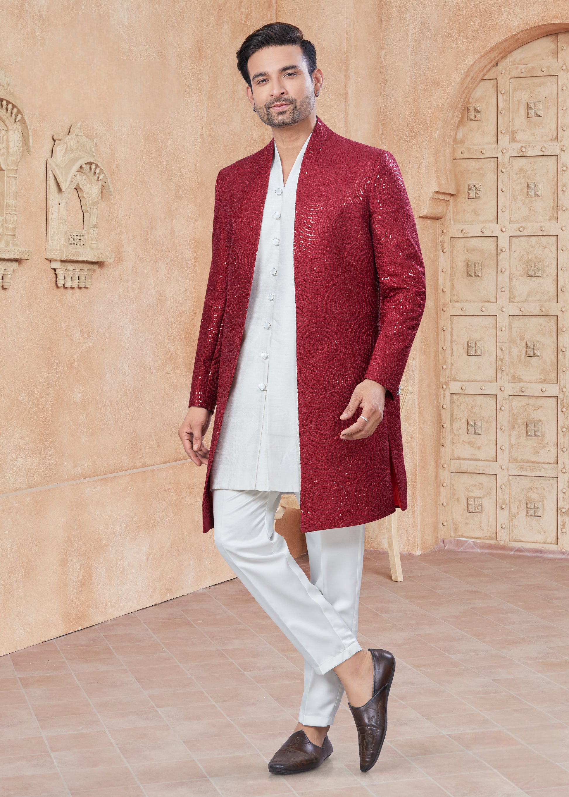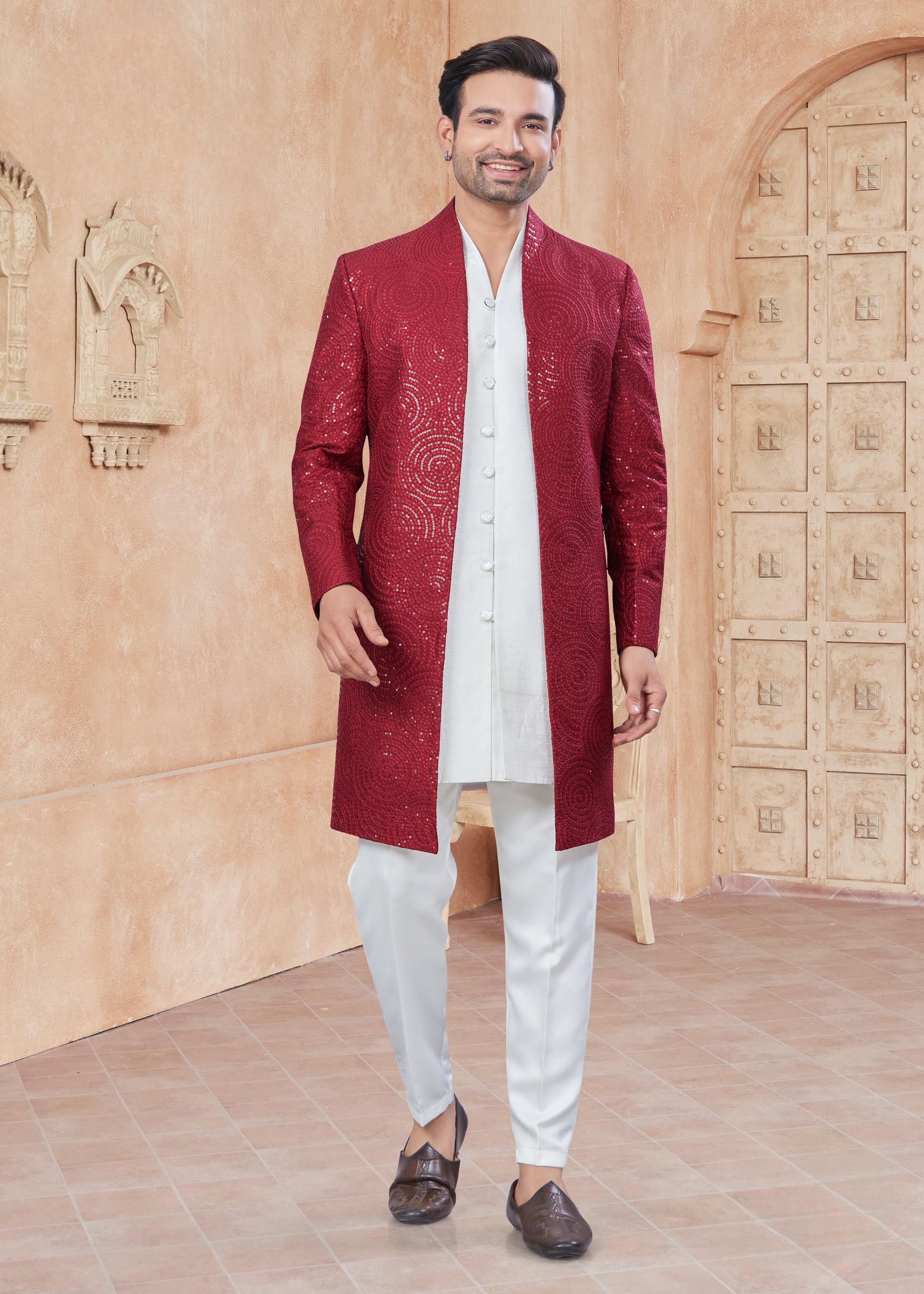 Sherwani Jacket rouge col kurta mi-long en pure soie et doublure avec mouchoir pour grands évènements