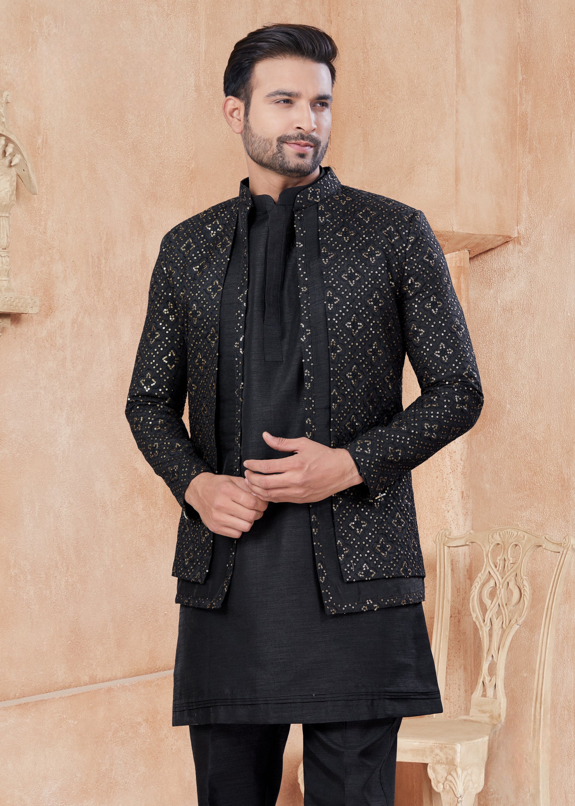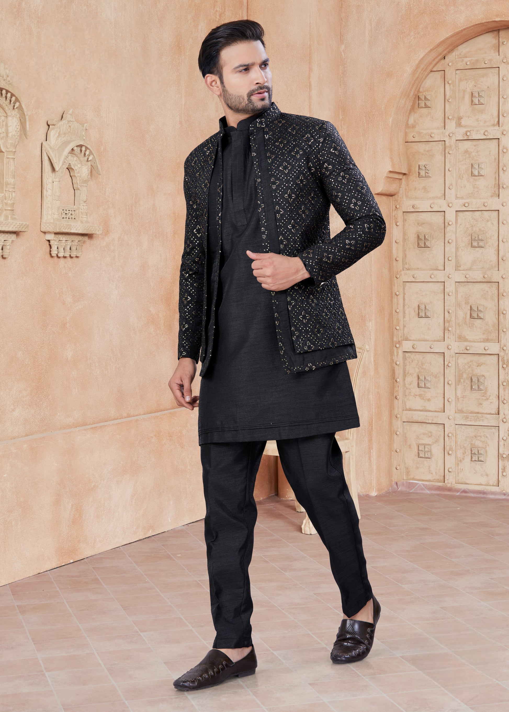 Sherwani Jacket mi-long noir en pure soie et doublure pour grands évènements