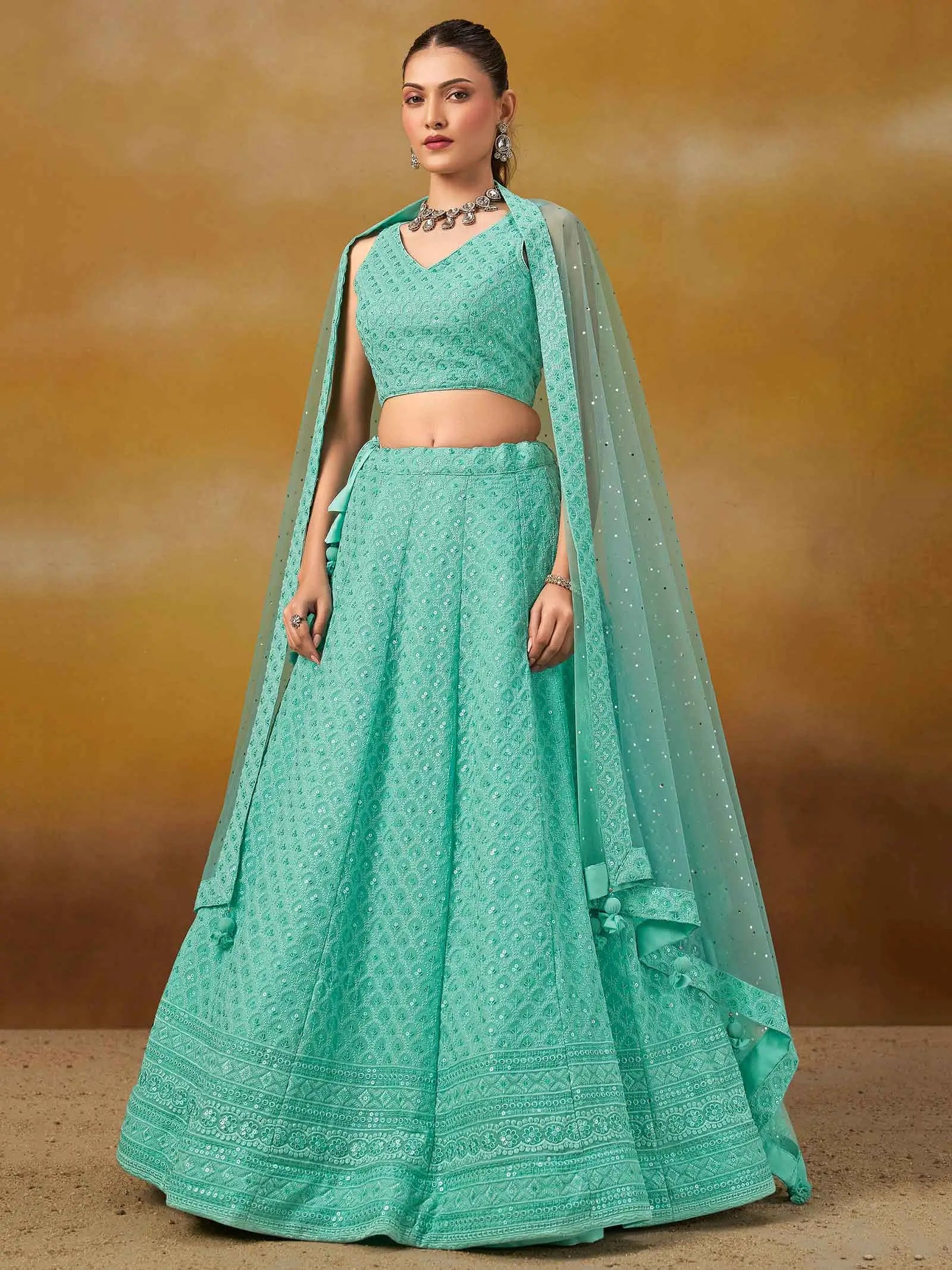 Lehenga bleu ciel somptueux avec broderie en sequins et dupatta