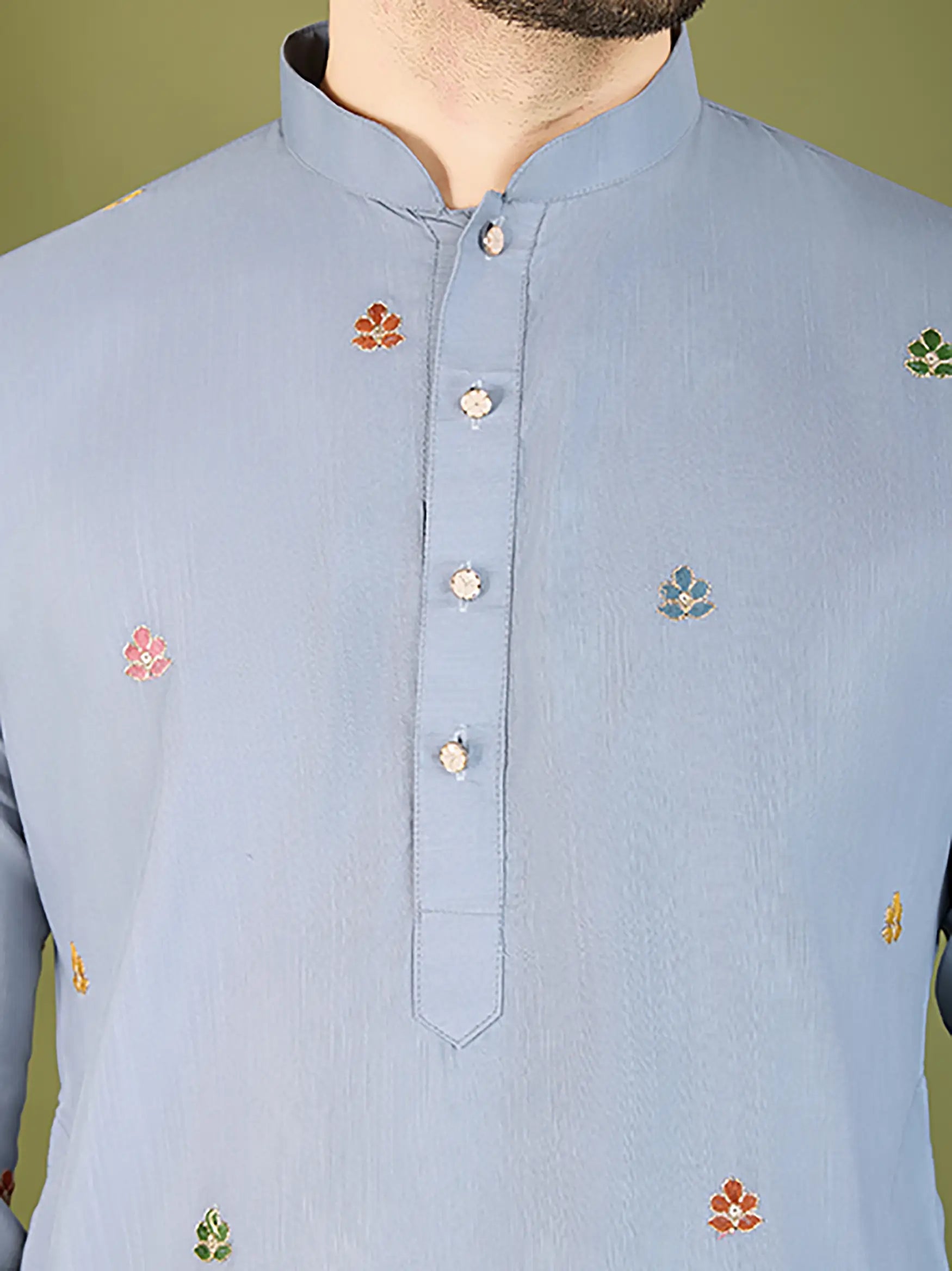 Kurta bleu ciel en coton avec broderie au fil et sequins