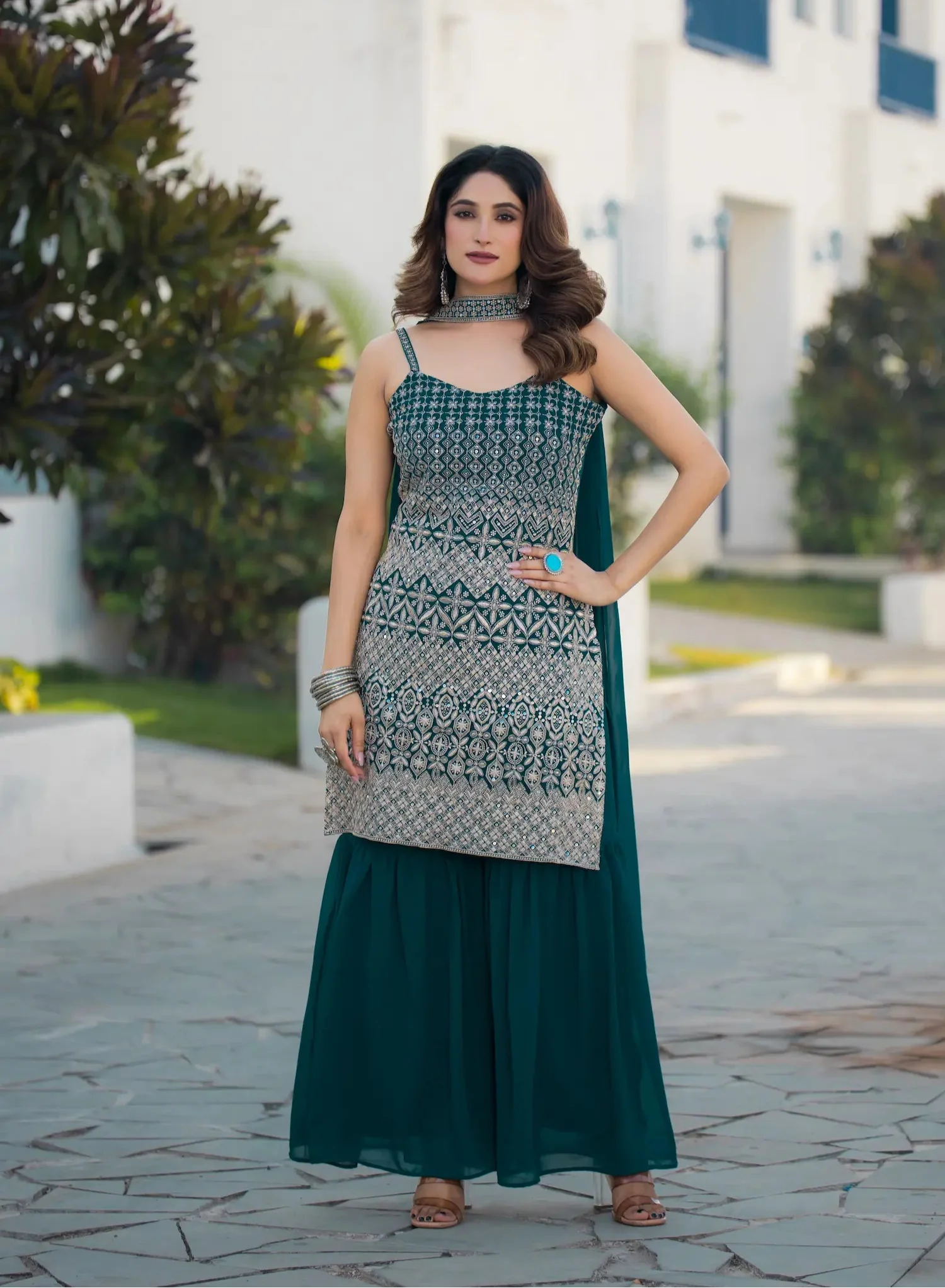 Le tout est accompagné d’un dupatta léger en georgette, sublimé par une bordure brodée de sequins, pour une touche finale lumineuse. Parfait pour les festivités, mariages ou soirées élégantes, cet ensemble est un incontournable pour briller avec grâce.