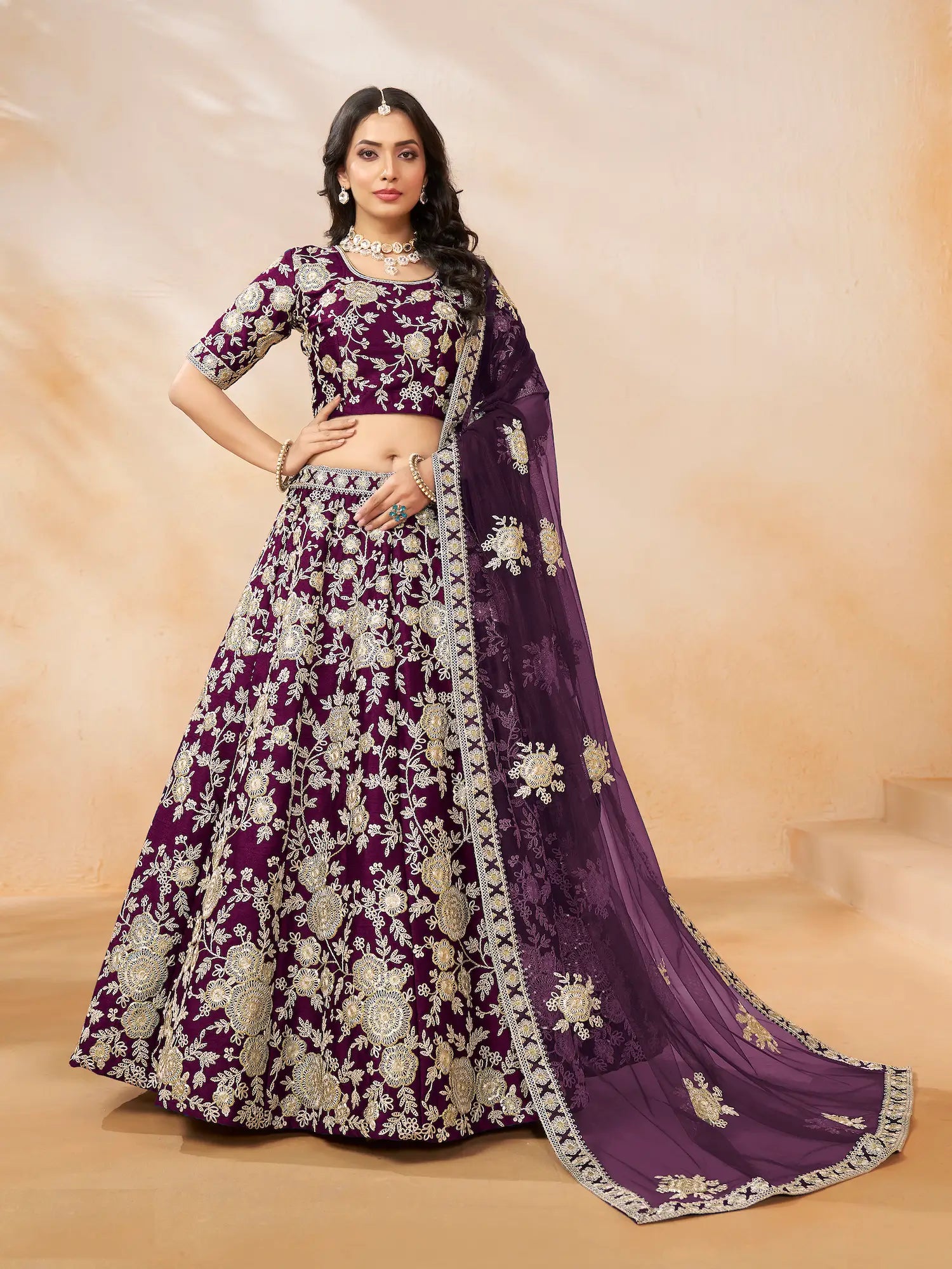 Lehenga Choli violet raisin en soie artificielle avec broderie au fil et sequins